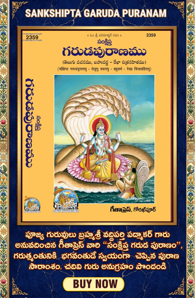 పూజ్య గురువులు బ్రహ్మశ్రీ వద్దిపర్తి పద్మాకర్ గారు అనువదించిన గీతాప్రెస్ వారి “సంక్షిప్త గరుడ పురాణం ” , గరుత్మంతునికి భగవంతుడే స్వయంగా చెప్పిన పురాణ సారాంశం . చదివి గురు అనుగ్రహం పొందండి